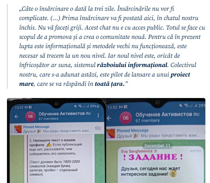 Toate postările sunt monitorizate riguros, iar comunicarea este coordonată prin grupuri și canale secrete de Telegram.