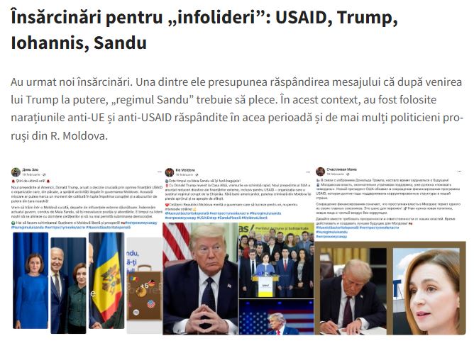 Una dintre însăricnările acordate așa-numiților „infolideri” a vizat răspândirea mesajului că după venirea lui Trump la putere, „regimul Sandu” trebuie să plece. În acest context, au fost folosite narațiunile anti-UE și anti-USAID răspândite în acea perioadă și de mai mulți politicieni pro-ruși din R. Moldova.