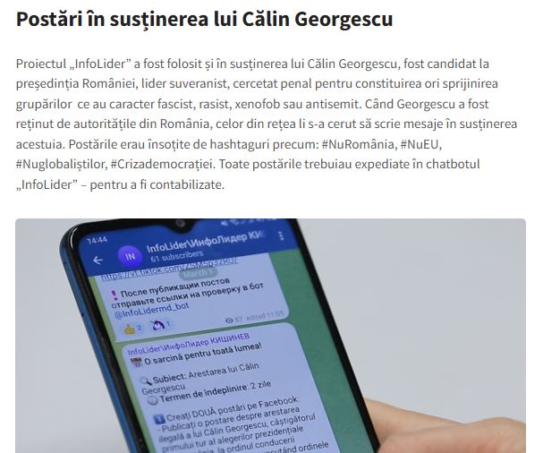 Proiectul „InfoLider” a fost folosit și în susținerea lui Călin Georgescu, fost candidat la președinția României, lider suveranist, cercetat penal pentru constituirea ori sprijinirea grupărilor ce au caracter fascist, rasist, xenofob sau antisemit. Când Georgescu a fost reținut de autoritățile din România, celor din rețea li s-a cerut să scrie mesaje în susținerea acestuia.