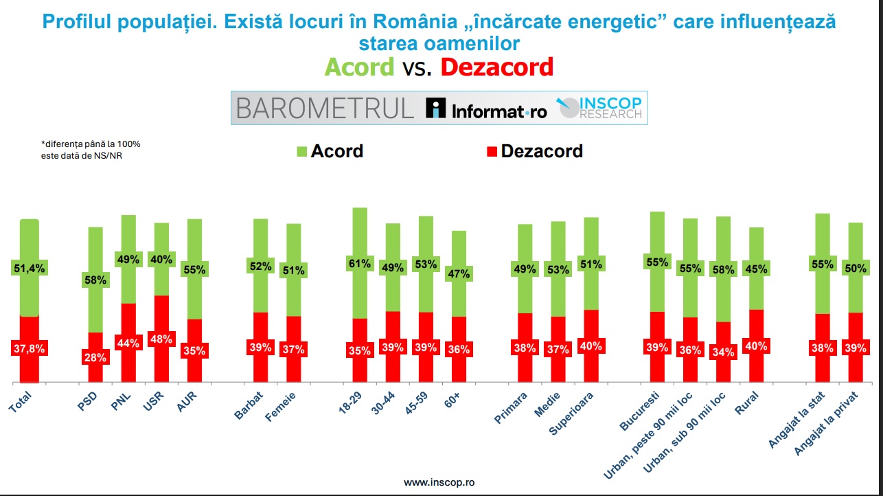 Potrivit sondajului INSCOP, 51,4% dintre români sunt de acord cu afirmația că în România există locuri „încărcate energetic” care influențează starea oamenilor. 37,8% își exprimă dezacordul față de această idee, iar 10,9% declară că nu știu sau nu pot aprecia.