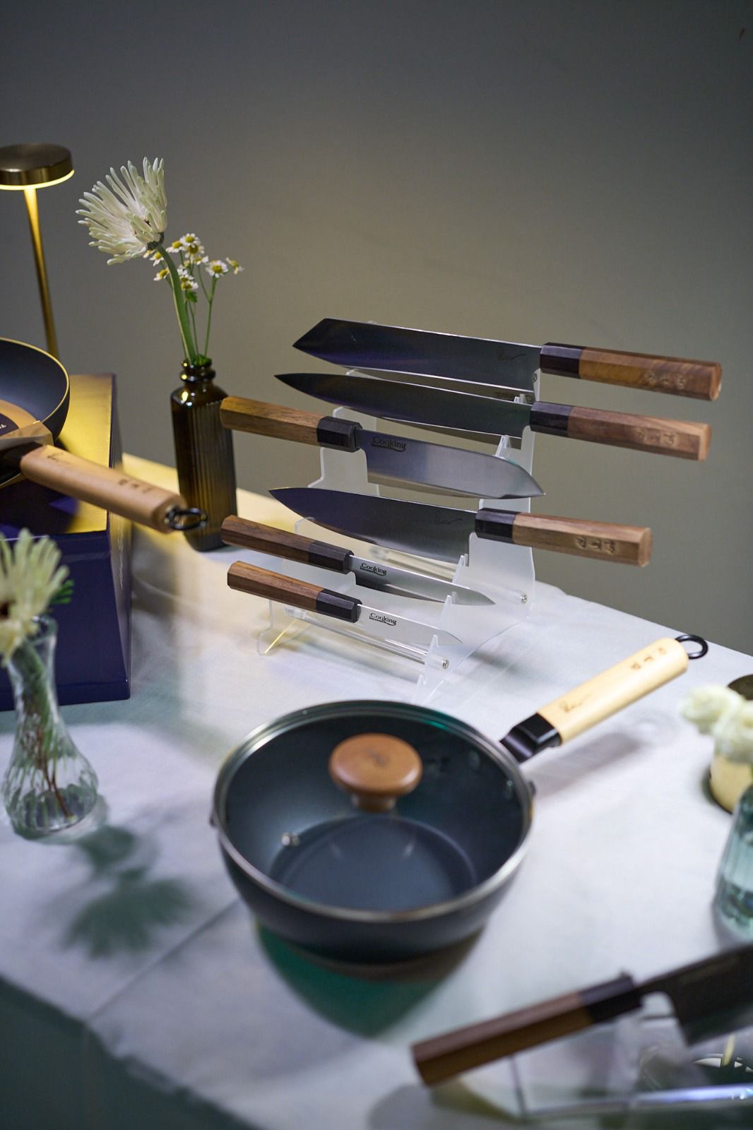 Colecția include 9 cuțite japoneze profesionale și 11 wokuri și oale din inox și aluminiu, fiecare piesă reflectând esența filosofiei japoneze: echilibru, simplitate și respect pentru ingredient.