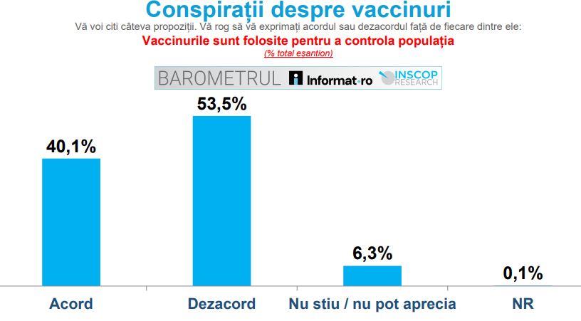 În același timp, 40.1% dintre respondenți sunt de acord cu afirmația „Vaccinurile sunt folosite pentru a controla populația”, în timp ce 53.5% sunt în dezacord. 6.3% nu știu sau nu pot aprecia, iar 0.1% nu răspund.