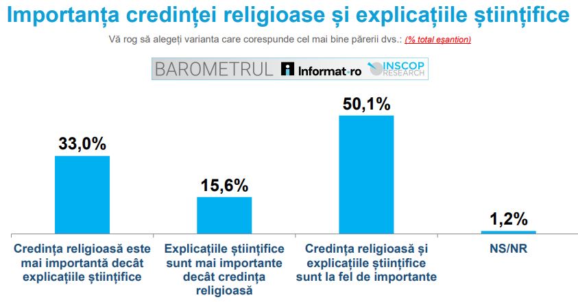 Pentru 33% dintre participanți consideră „Credința religioasă este mai importantă decât explicațiile științifice”. 15.6% consideră că „Explicațiile științifice sunt mai importante decât credința religioasă. 50.1% aleg varianta „Credința religioasă și explicațiile științifice sunt la fel de importante”. Ponderea non-răspunsurilor este de 1.2%.