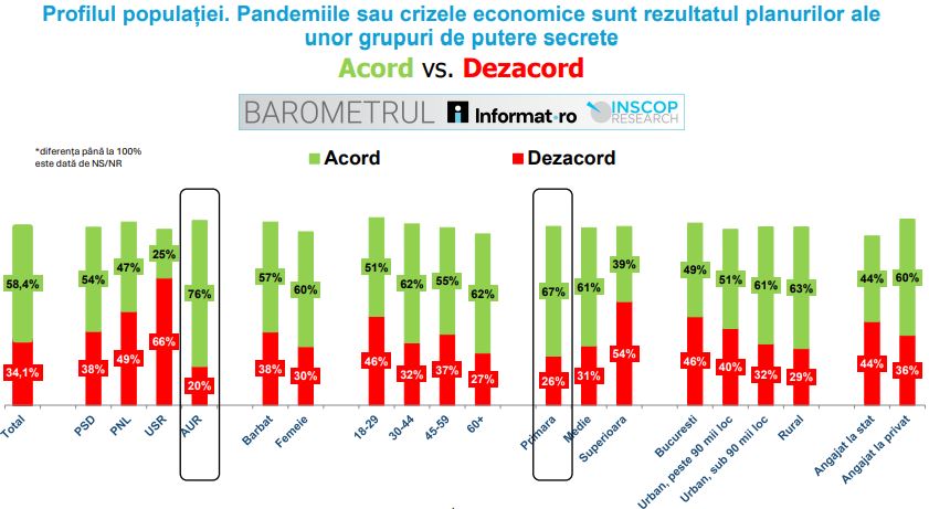 58.4% dintre cei intervievați cred că „Pandemiile sau crizele economice sunt rezultatul planurilor unor grupuri de putere secrete”, în timp ce 34.1% sunt de părerea contrarie. 7.3% nu știu sau nu pot aprecia, iar 0.2% nu răspund.