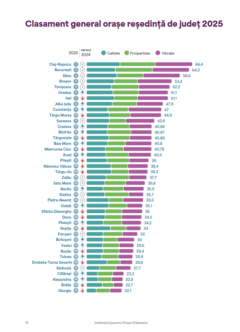 „Primele zece orașe din clasament nu sunt fundamental diferite de cele din 2024, însă îi invităm pe cititori să privească mai atent spre mijlocul clasamentului - acolo unde dinamica este mai mare și unde se vede cel mai bine ambiția orașelor care se consolidează și cresc”, a transmis Felix Tătaru, președintele Instititului pentru Orașe Vizionare.