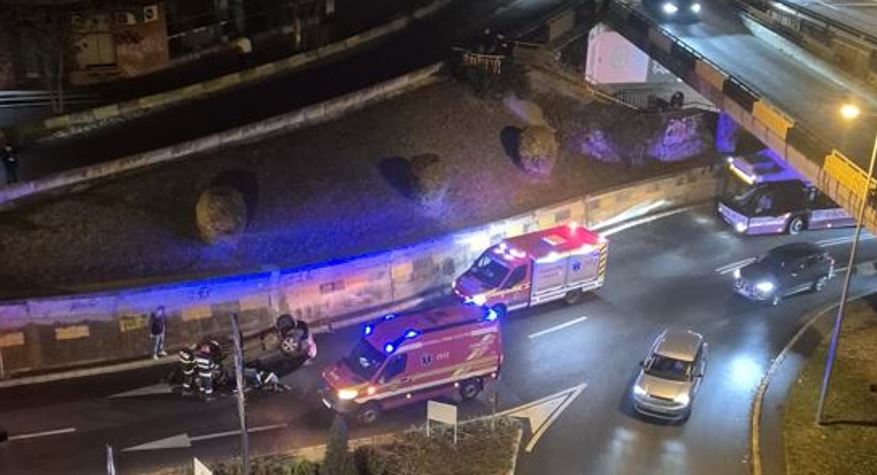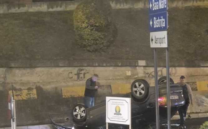 Accident rutier produs luni seară în cartierul Mărăști. O mașină s-a răsturnat sub podul de pe strada Aurel Vlaicu.