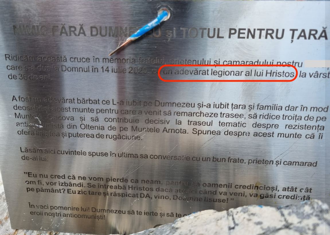 La baza crucii este și o plachetă în memoria unui tânăr care a murit în 2020 și care este numit «fratele, prietenul și camaradul nostru» (al autorilor plachetei), «un adevărat legionar al lui Hristos»”, notează Bogdan Pacurar în mesajul citat.
