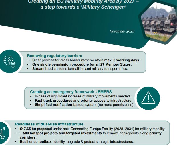De asemenea, un nou sistem de răspuns consolidat la mobilitatea militară europeană (EMERS) pentru proceduri accelerate și acces prioritar la infrastructură va sprijini forțele armate care acționează în contextul UE sau NATO.