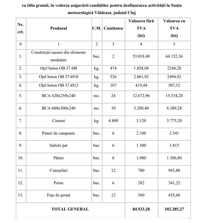 „Se aprobă scoaterea din rezervele de stat şi acordarea imediată ca ajutoare umanitare interne de urgenţă, cu titlu gratuit, a unor cantităţi de produse (...), în valoare de 84.533,28 lei fără TVA, în vederea asigurării condițiilor pentru desfășurarea activității la Stația meteorologică Vlădeasa, județul Cluj, distrusă de un incendiu devastator”, se arată în proiectul promovat de Guvern.