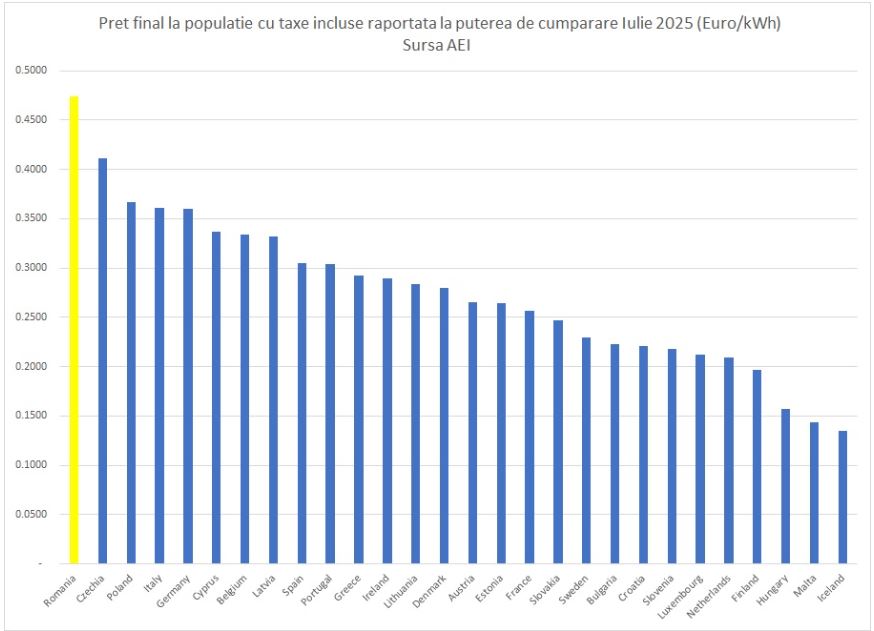 „În fapt în luna iulie 2025 România a înregistrat pentru populație cel mai mare preț al energiei electrice raportat la puterea de cumpărare din Europa.