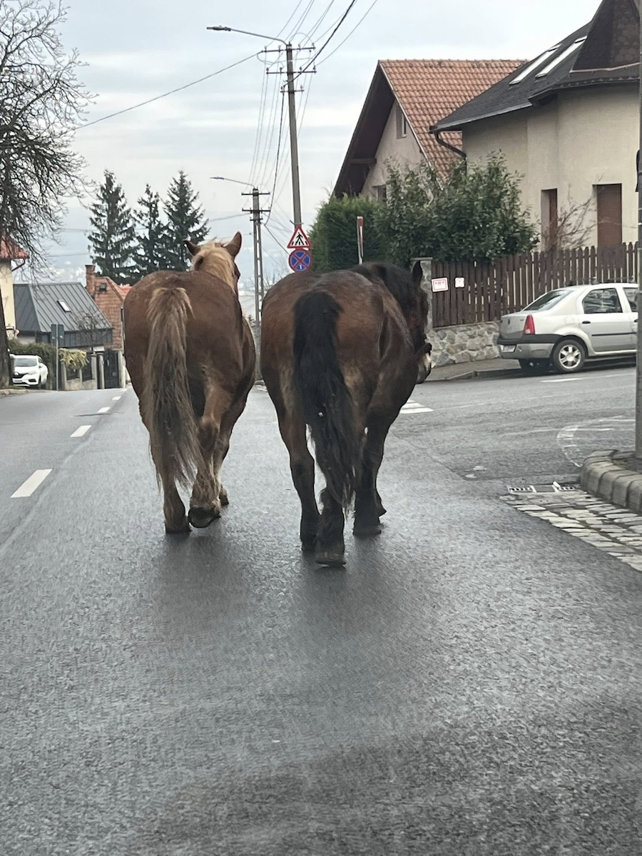 Duminică, 7 decembrie 2025, doi cai au fost fotografiați în timp ce se plimbau pe stradă în municipiul Cluj-Napoca.