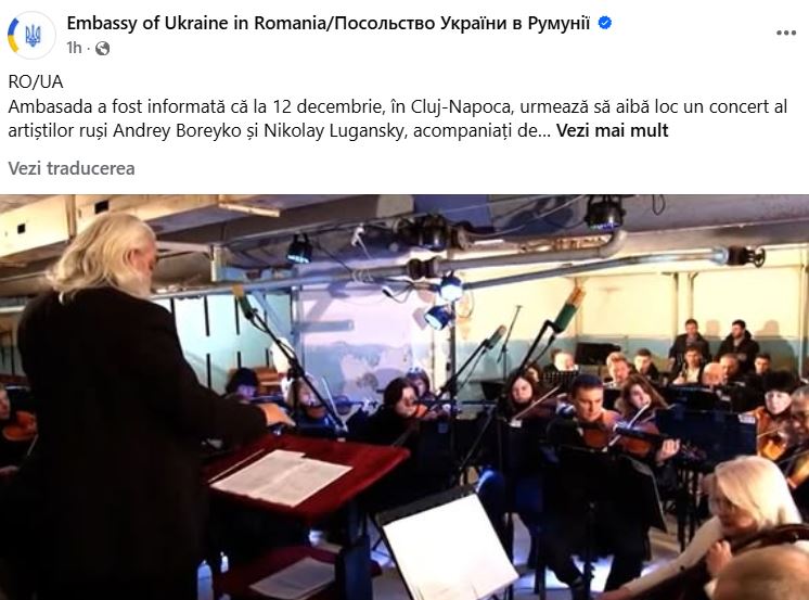 „Ambasada a fost informată că la 12 decembrie, în Cluj-Napoca, urmează să aibă loc un concert al artiștilor ruși Andrey Boreyko și Nikolay Lugansky, acompaniați de Orchestra Filarmonicii de Stat „Transilvania”. Numeroși locuitori și oaspeți ai orașului se vor alătura unei seri de muzică clasică, admirând lumina și atmosfera sălii de concert. Vor răsuna aplauze pentru artiști care se pregătesc pentru concertele lor și își perfecționează măiestria muzicală într-un stat care, zi de zi, îi forțează pe milioane de ucraineni să asculte alte «sunete»: exploziile rachetelor, zgomotul dronelor și sirenele de alertă aeriană”, se arată în mesajul publicat de Ambasada Ucrainei în România pe pagina de Facebook.