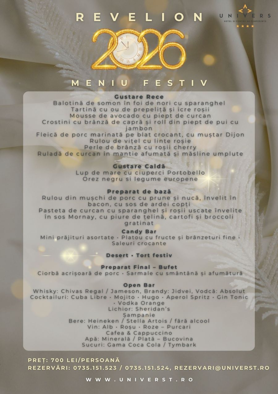 Pentru noaptea de 31 decembrie, Hotel Univers propune o petrecere extraordinară, pregătită cu atenție la fiecare detaliu, astfel încât invitații să se poată bucura de întreaga seară în ritmul lor.