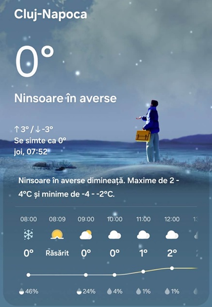 Temperatura: în jur de 0 … 3 °C pe parcursul zilei, fără să crească mult mai mult.