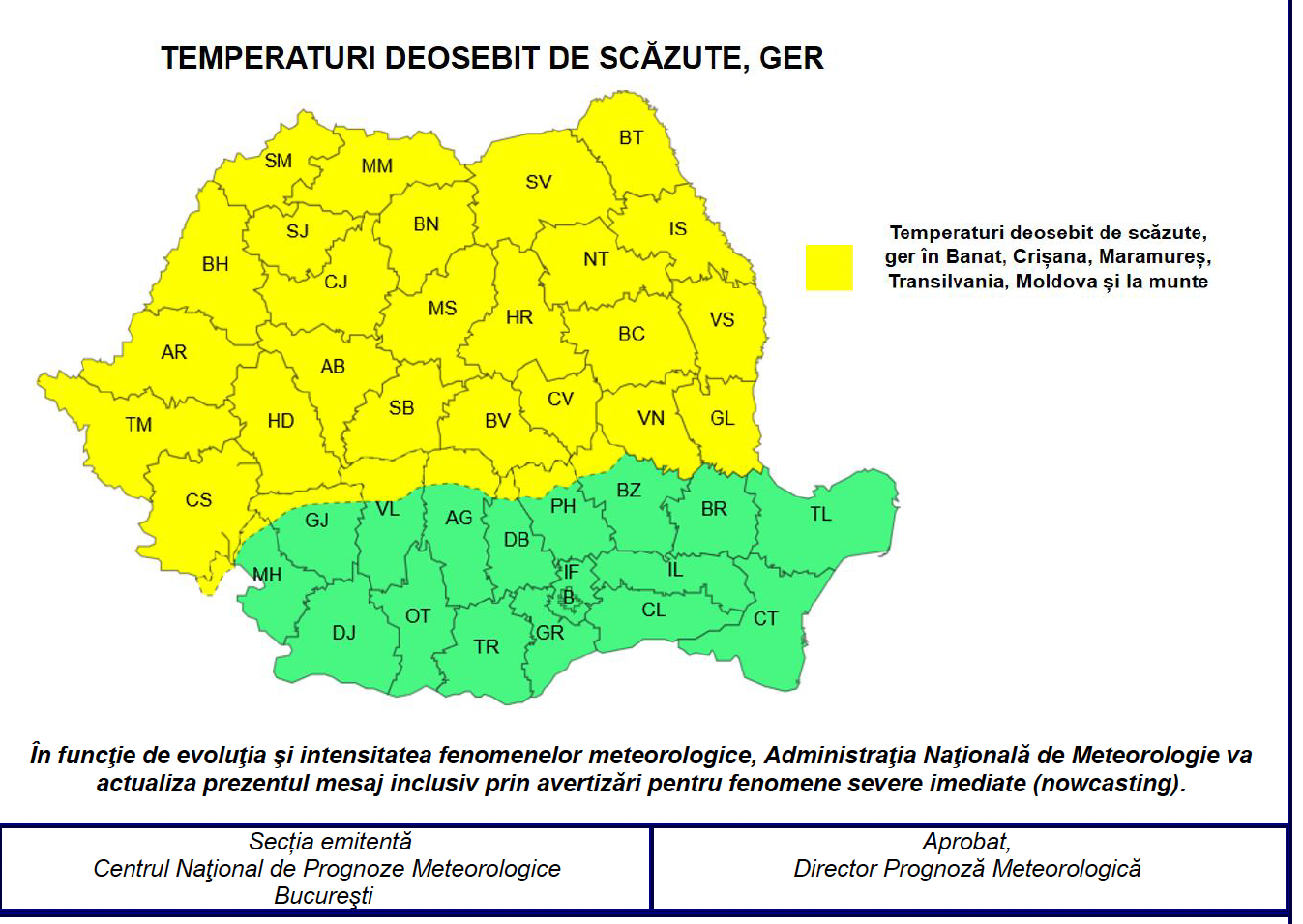 De sâmbătă noapte și până marți (13 ianuarie) vremea va deveni deosebit de rece în toate regiunile, geroasă îndeosebi în timpul nopților și dimineților în Banat, Crișana, Maramureș, Transilvania, Moldova, precum și la munte și pe arii restrânse în rest.