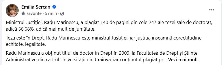 Conținutul plagiat provine din trei lucrări, semnalează Emilia Sercan într-un mesaj publicat pe pagina de Facebook.