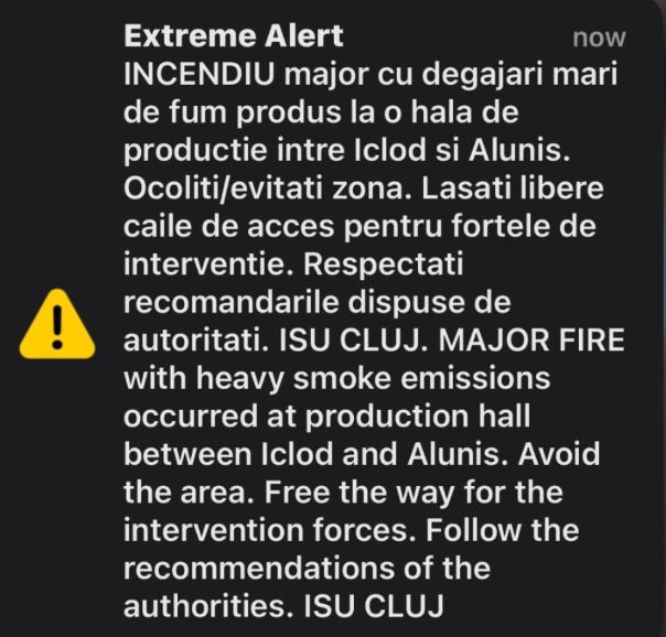Incendiu puternic la o fabrică din Iclod. Pompierii intervin cu 9 autospeciale. Forțe de sprijin din alte județe, chemate la Cluj. A fost emis mesaj Ro-Alert de avertizare.