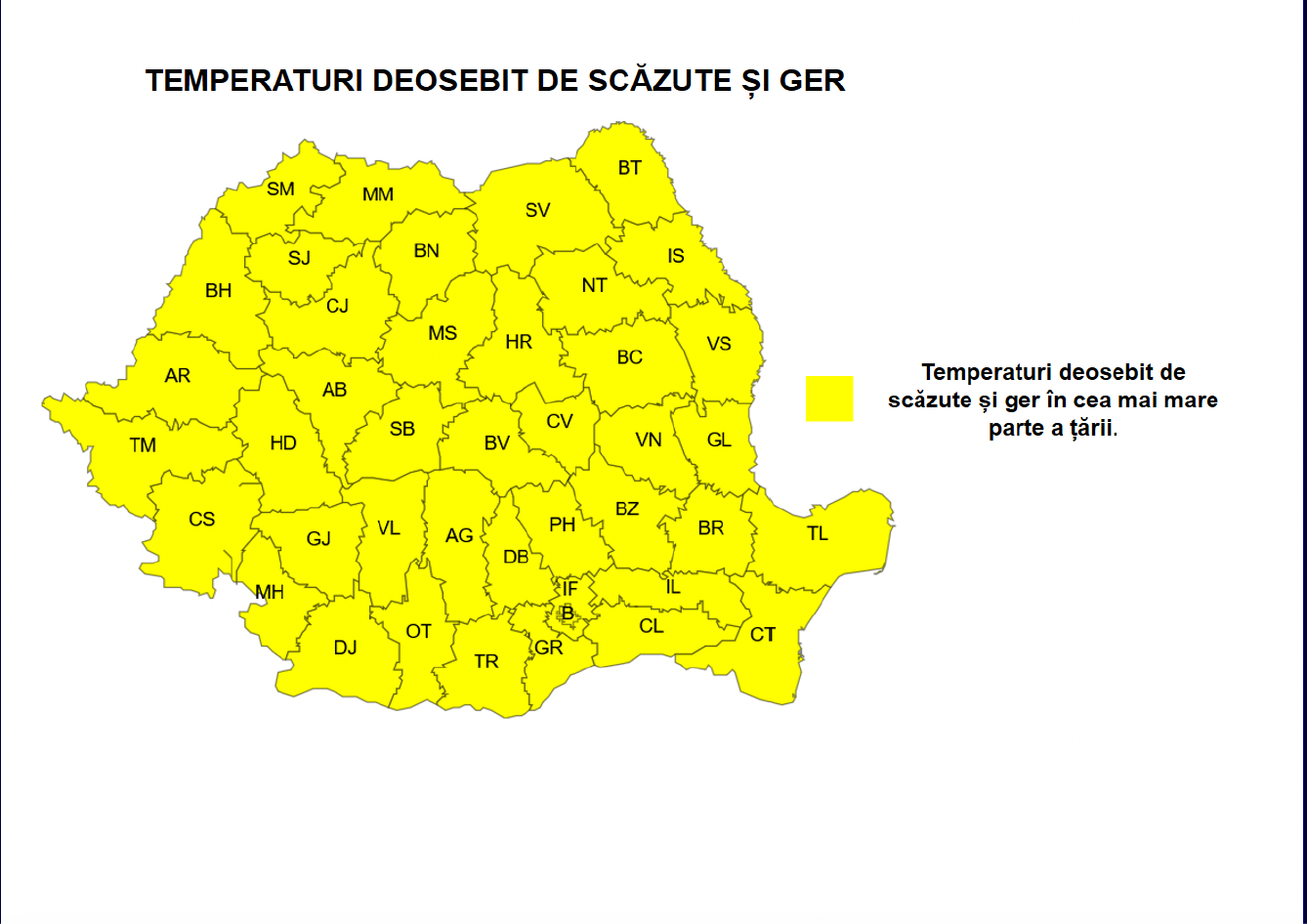 „În cea mai mare parte a Moldovei și Transilvaniei, în Dobrogea, în sudul, centrul și estul Munteniei, precum și în sudul Olteniei se vor înregistra temperaturi deosebit de scăzute (în medie cu 5...9 grade mai mici decât cele normale datei), cu valori ce se vor încadra în general între -8 și -4 grade. În nordul Moldovei, precum și în depresiunile și văile din Transilvania, gerul va persista și vor fi temperaturi în jurul a -10 grade”, a transmis ANM.