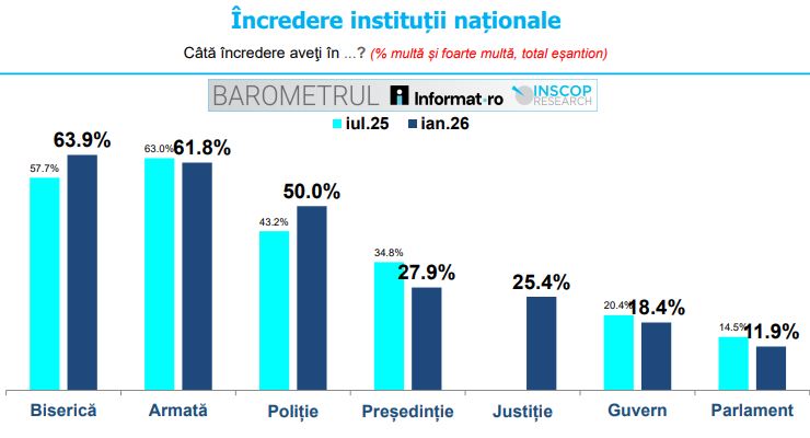 Biserica este instituția în care românii au cea mai mare încredere, 63.9% declarând că au destul de multă și foarte multă încredere în această instituție (față de 57.7% în iulie 2025).
