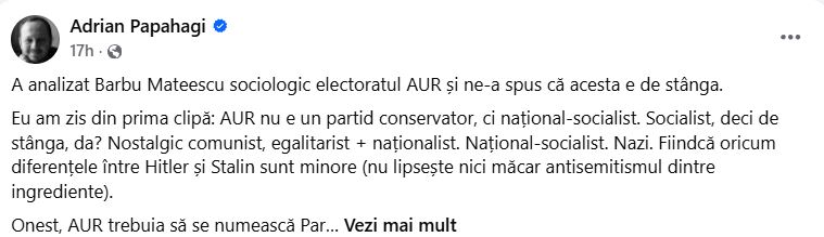 Adrian Papahagi: „AUR nu e un partid conservator, ci național-socialist”.
