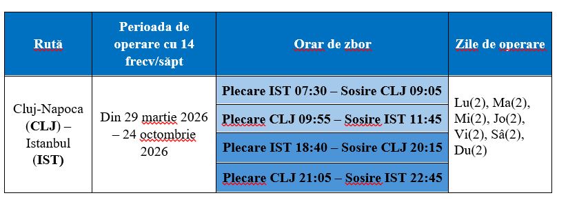 Aeroportul Internațional Avram Iancu Cluj, Consiliul Județean Cluj și compania aeriană Turkish Airlines anunță în premieră dublarea frecvențelor pentru zborurile directe spre Istanbul începând cu sezonul de vară S2026.