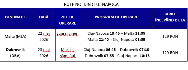 Anunțul operării zborurilor Wizz Air către cele două destinații, Malta și Dubrovnik, în sezonul de vară 2026 demonstrează în mod clar că direcția de dezvoltare asumată și investițiile realizate produc rezultate concrete. Performanța Aeroportului Internațional Cluj se menține la un nivel european, iar Consiliul Județean va continua să susțină extinderea și modernizarea acestuia, astfel încât județul Cluj să rămână un reper de excelență și dezvoltare pentru întreaga regiune de Nord-Vest”, a precizat Alin Tișe, preşedintele Consiliului Judeţean Cluj.