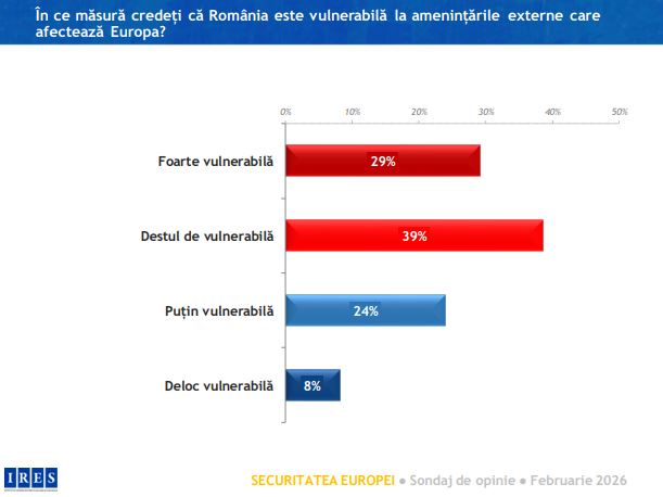 *68% percep România ca fiind vulnerabilă la amenințările externe care afectează continentul.