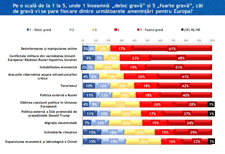 Războiul din proximitatea Uniunii Europene rămâne principala sursă de îngrijorare, însă tabloul insecurității este mai larg: instabilitatea economică, atacurile cibernetice și, mai ales, dezinformarea și manipularea online sunt percepute drept riscuri structurale majore.