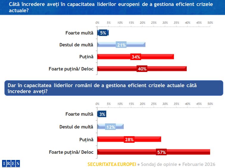 *Doar 26% au încredere ridicată în liderii europeni pentru gestionarea crizelor, iar doar 15% în liderii români.