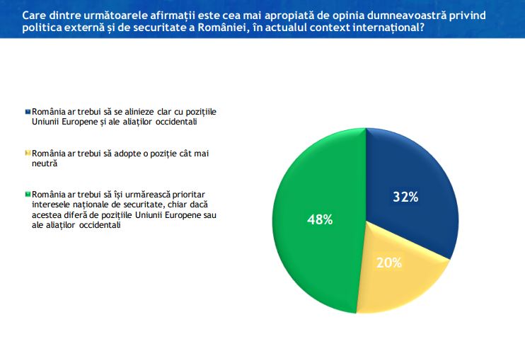 *48% susțin că România ar trebui să își prioritizeze interesele naționale de securitate, chiar și în situația unor diferențe față de pozițiile UE sau ale aliaților occidentali.
