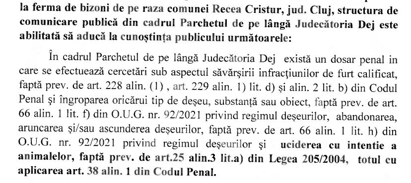 Parchetul de pe lângă Judecătoria Dej a anunțat, vineri, că a deschis un dosar penal în cazul fermei din Recea Cristur, unde au fost descoperite peste 200 cadavre de bizoni, cerbi și căprioare.