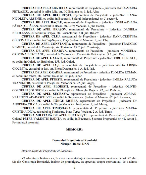 „Vă adresăm solicitarea ca, în exercitarea atribuţiei dumneavoastră prevăzute de art. 77 alin. (2) din Constituţia României, înainte de promulgare, să apreciaţi asupra oportunităţii de a adresa Parlamentului României o cerere de reexaminare, în ansamblul său, a Legii pentru modificarea şi completarea unor acte normative din domeniul pensiilor de serviciu (PL-x nr. 522/2025)”, se arată în memoriul formulat de conducerile curților de apel din țară.