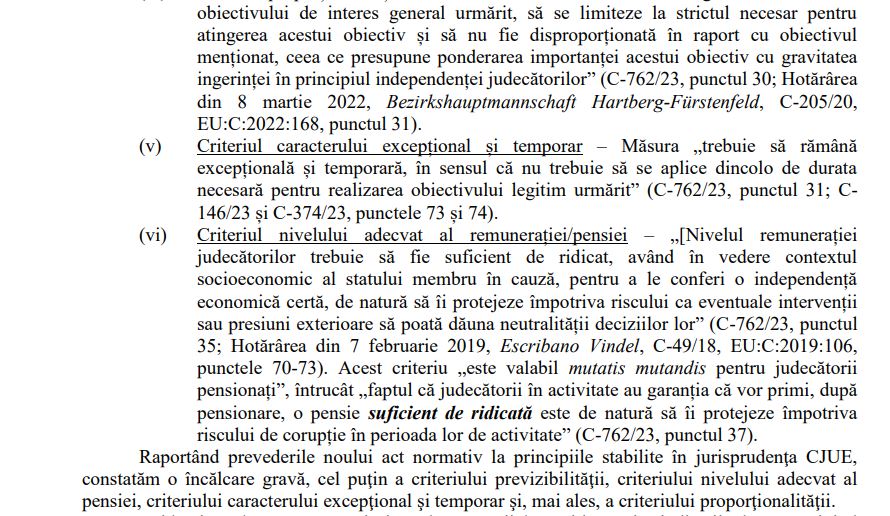 „În consecință, orice măsură legislativă națională care afectează condițiile statutare și materiale ale judecătorilor, inclusiv regimul pensiilor de serviciu, intră în domeniul de aplicare al dreptului Uniunii în măsura în care este susceptibilă să influențeze independența acestora, astfel cum a statuat în mod constant Curtea de Justiție”, potrivit memoriului citat.