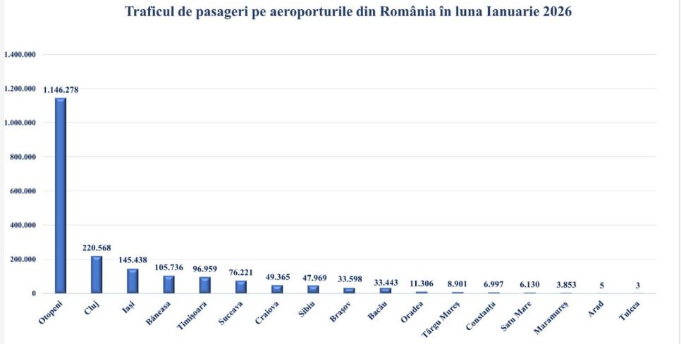 În ianuarie 2026, aeroporturile din România au înregistrat un trafic total de 1.992.770 pasageri, confirmând evoluția pozitivă a sectorului aviației civile.