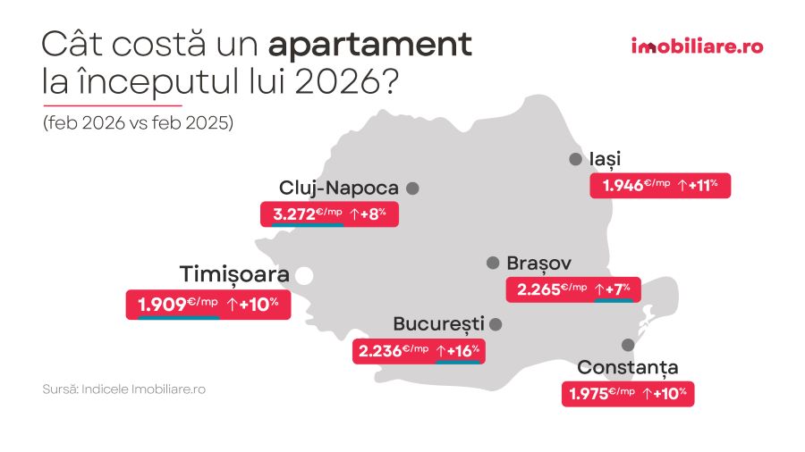 Pe segmentul locuințelor noi, prețurile au continuat să urce, însă într-un ritm ceva mai moderat. În februarie 2026, apartamentele noi au ieșit în piață cu un preț mediu de 3.378 euro/mp,după o creștere de aproximativ 6% în ultimele 12 luni.