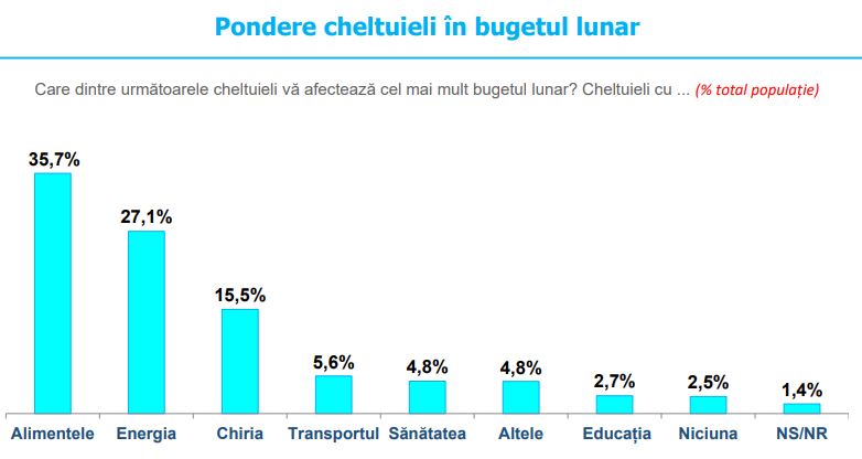 Întrebați care dintre cheltuieli le afectează cel mai mult bugetul lunar, 35.7% dintre respondenți au indicat cheltuielile cu alimentele, 27.1% pe cele cu energia, iar 15.5% cheltuielile cu chiria. 5.6% declară că transportul le afectează cel mai mult bugetul, în timp ce 4.8% menționează sănătatea și 2.7% educația. 4.8% indică alte tipuri de cheltuieli, iar 2.5% afirmă că nicio categorie nu le afectează semnificativ bugetul lunar. Ponderea non-răspunsurilor este de 1.4%.