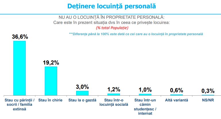 36.6% din totalul respondenților spun că în prezent stau cu părinții/socrii/familia extinsă, 19.2% locuiesc în chirie, 3% la o gazdă, 1.2% într-o locuință socială, iar 1% stau într-un cămin studențesc/internat. 0.6% indică altă variantă, iar 0.3% nu știu sau nu răspund.