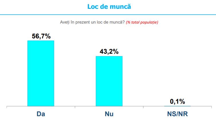 56.7% dintre participanți au în prezent un loc de muncă, pe când 43.2% nu sunt angajați. Ponderea non-răspunsurilor este de 0.1%.