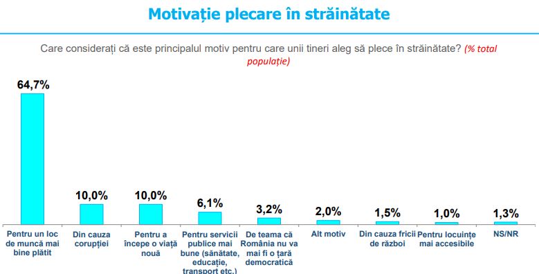 64.7% dintre tineri menționează ca principalul motiv pentru care unii aleg să plece în străinătate dorința de a obține un loc de muncă mai bine plătit, 10% din cauza corupției, iar 10% pentru a începe o viață nouă.