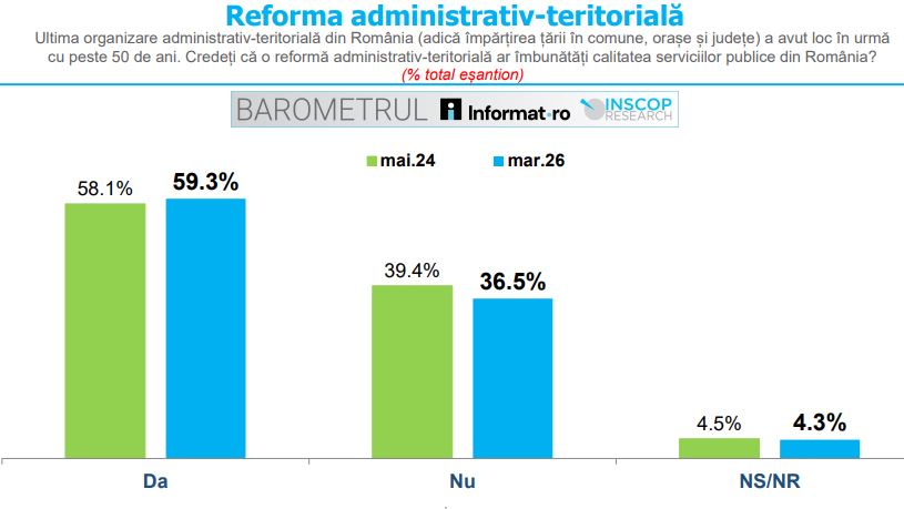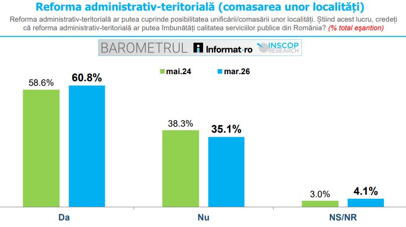 Aproape 60% dintre români consideră că reforma administrativ-teritorială ar îmbunătăți serviciile publice, potrivit Barometrului Informat.ro – INSCOP Research realizat în perioada 2-6 martie 2026.
