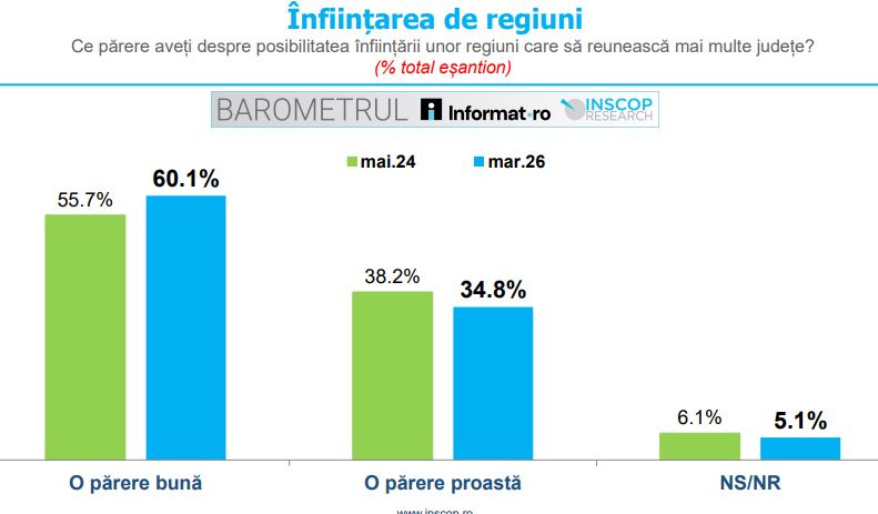 Sondajul arată și că 60,1% dintre români susțin înființarea unor regiuni care să reunească mai multe județe, comparativ cu 55,7% în mai 2024. În același timp, 34,8% se opun, iar 5,1% nu știu sau nu răspund.