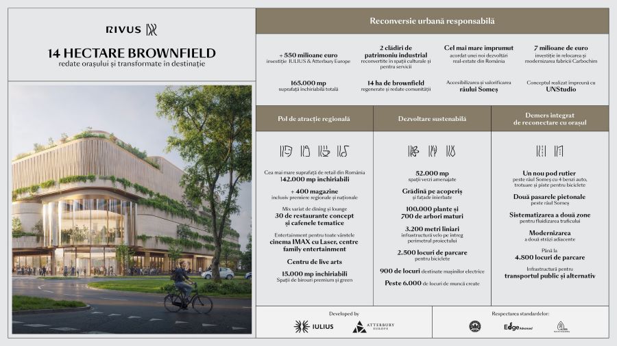 Proiectul RIVUS Cluj-Napoca, dezvoltat de IULIUS și Atterbury Europe, intră în etapa de execuție. Cu o investiție estimată la peste jumătate de miliard de euro, este cea mai amplă dezvoltare real-estate prin reconversie urbană în desfășurare din România. Demersul transformă fosta platformă industrială Carbochim, în prezent relocată și retehnologizată, într-o destinație reper, cu un mix de funcțiuni personalizat pentru dinamica orașului Cluj-Napoca: culturale, educaționale, de entertainment, office, retail, parc și spații pentru petrecerea timpului în aer liber. Conceptul, realizat împreună cu celebrul birou internațional de arhitectură UNStudio, pune accent pe sustenabilitate, integrare fluidă, comunitate și identitate locală – https://www.youtube.com/watch?v=AEyhkj7fbYA&feature=youtu.be.