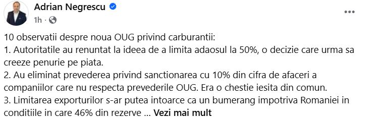 „Autoritățile au renunțat la ideea de a limita adaosul la 50%, o decizie care urma să creeze penurie pe piață. Au eliminat prevederea privind sancționarea cu 10% din cifra de afaceri a companiilor care nu respectă prevederile ordonanței. Era o măsură ieșită din comun”, a scris Adrian Negrescu pe pagina sa de Facebook, citat de Agerpres.ro