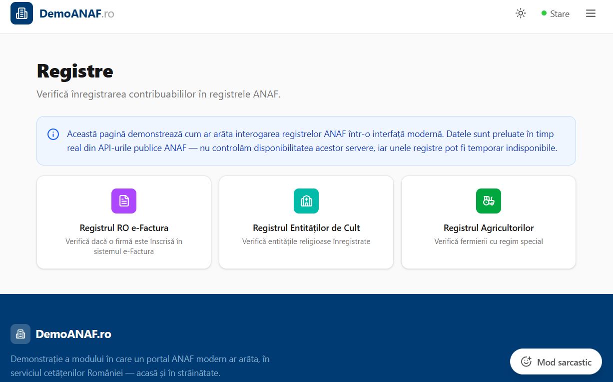 demoanaf.ro ia exact aceleași date publice (API-urile ANAF, BNR) și le servește într-o interfață modernă, rapidă și accesibilă. Verificare CUI, curs valutar, calendar fiscal, validare e-Factura, coduri CAEN, IBAN-uri trezorerie — totul sub 2 secunde”, explică Daniel Tămaș într-un mesaj publicat pe pagina sa de Facebook.