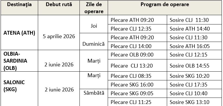 Ruta Cluj-Napoca – Salonic va fi operată începând cu data de 2 iunie 2026, cu două frecvențe pe săptămână, în zilele de marți și sâmbătă, pe durata sezonului de vară S26.