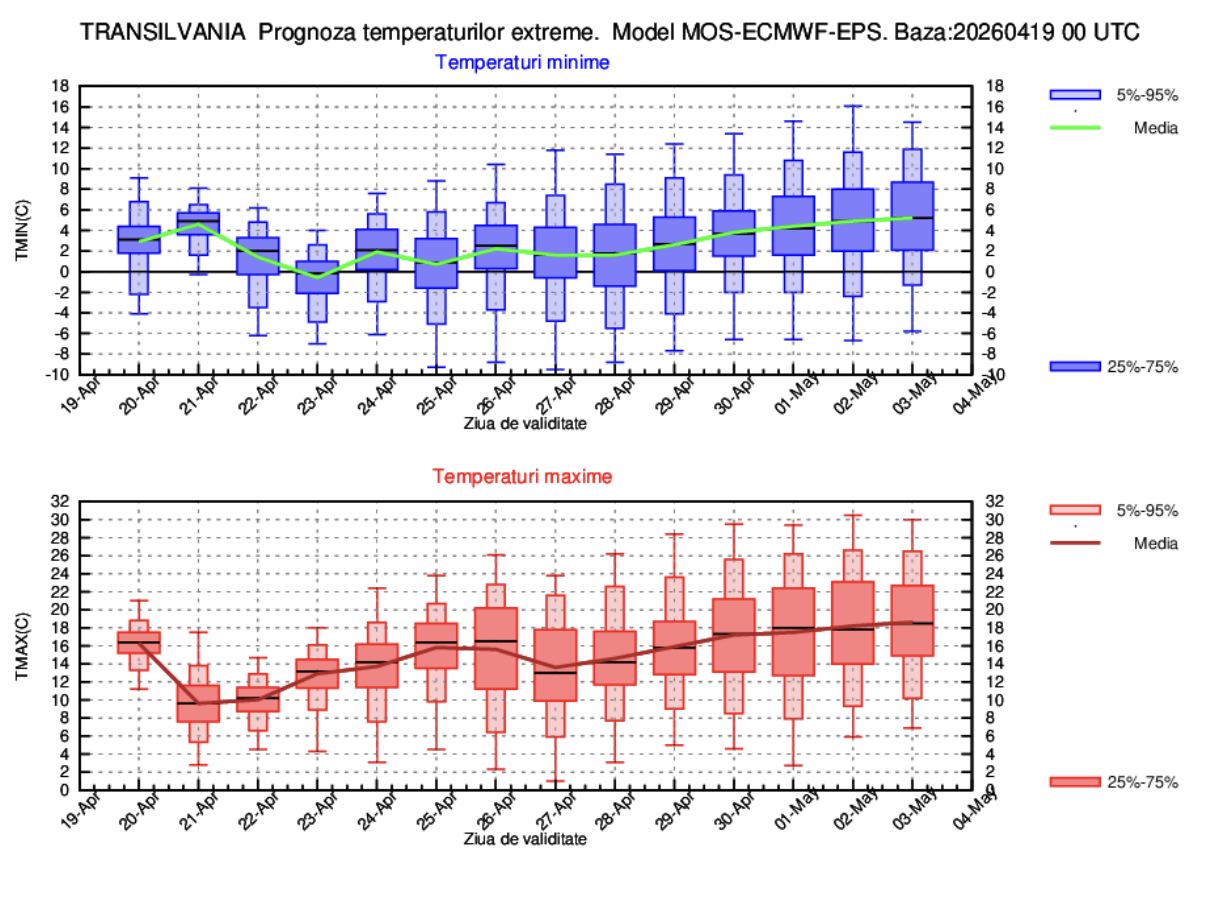 „În prima zi din interval, vor fi temperaturi maxime de 16-18 grade și minime de 4-6 grade (valori apropiate de normalul climatologic), însă vremea va deveni rece în perioada 21-23 aprilie, când media temperaturilor maxime va fi de cel mult 10-11 grade, iar minimele vor fi în general de 0-2 grade (cu valori preponderent negative mai ales în depresiuni și condiții de brumă). În perioada 23 – 28 aprilie, deși vor fi variații de la o zi la alta (încălzire ușoară în 24 și 25 aprilie și o nouă răcire posibilă în 26 și 27 aprilie), valorile termice se vor menține ușor sub mediile multianuale specifice perioadei, cu o medie a maximelor de 14-16 și minime în jurul a 2 grade. Spre finalul lunii aprilie și începutul lunii mai, scenariul cel mai probabil indicat de prezenta estimare este de încălzire treptată, astfel media zilnică a temperaturilor maxime va urca spre 18 grade, iar a celor minime la valori de 4-5 grade. Precipitații predominant sub formă de ploaie se vor semnala în perioada 20 – 22 aprilie, când și cantitățile de apă vor fi pe arii restrânse însemnate. Intervale cu ploi sunt probabile și după 27 aprilie”, au anunțat metorologii.
