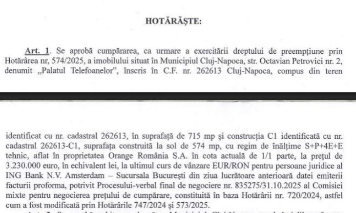 „Se aprobă achitarea de către municipiul Cluj-Napoca a cheltuielor aferente încheierii contractului de vânzare-cumpărare a imobilului”, se arată în documentația citată.