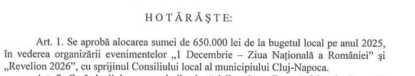 „Se aprobă alocarea sumei de 650.000 de lei de la bugetul local pe anul 2025, în vederea organizării evenimentelor 1 Decembrie – Ziua Națională a României și Revelion 2026, cu sprijinul Consiliului Local al municipiului Cluj-Napoca”, se arată în proiectul supus dezbaterii.