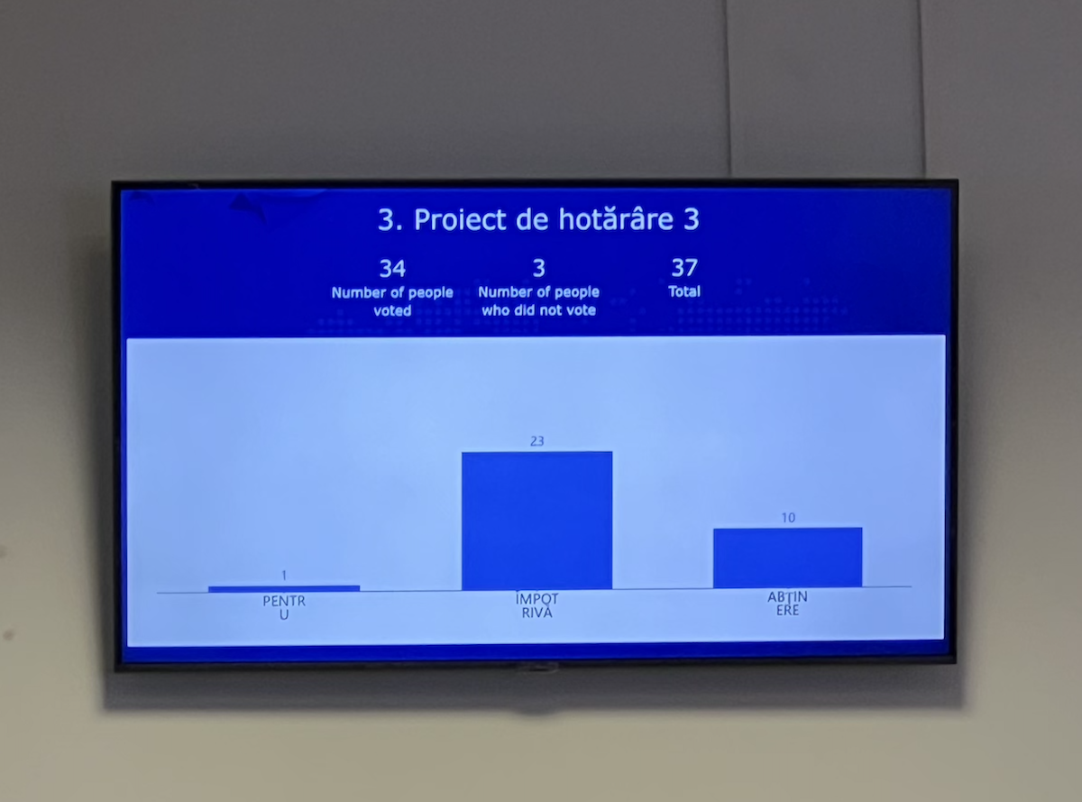 În cele din urmă, la vot, proiectul nu a trecut, deoarece din totalul de 37 de consilieri județeni prezenți, 34 au votat în felul următor: 23 de voturi au fost împotriva și 10 abțineri.