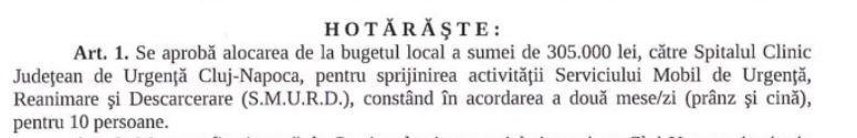 Mai exact, consilierii locali vor aproba în ședința de săptămâna viitoare un proiect de hotărâre privind alocarea sumei de 305.000 de lei către Spitalul Clinic Județean de Urgență Cluj-Napoca, pentru sprijinirea activității SMURD și care constă în acordarea a două mese pe zi – prânz și cină, pentru zece persoane.